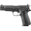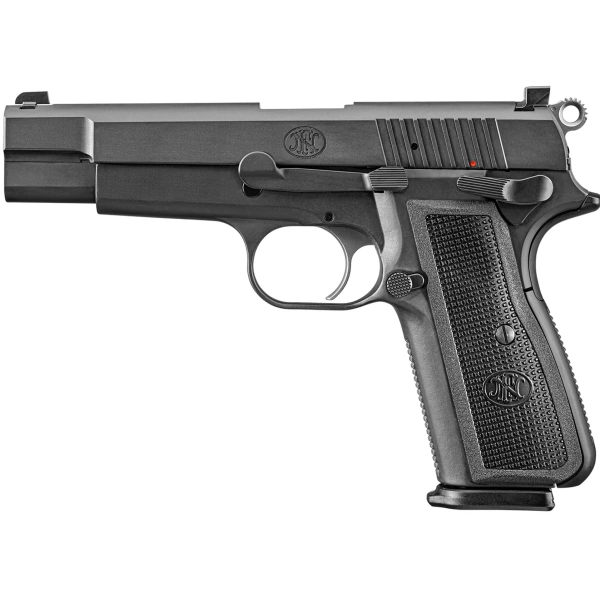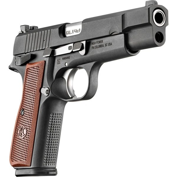 At 40-oz., the robust design keeps the signature rake of the dust cover and long arm slide release, adding ambi-controls for instinctive operation. An extended beavertail and raised hammer fit perfectly in hand. The FN High Power takes down instantly for maintenance, deletes the magazine disconnect, and ensures that most modern factory loads feed smoothly over the polished ramp of the cold hammer forged barrel.