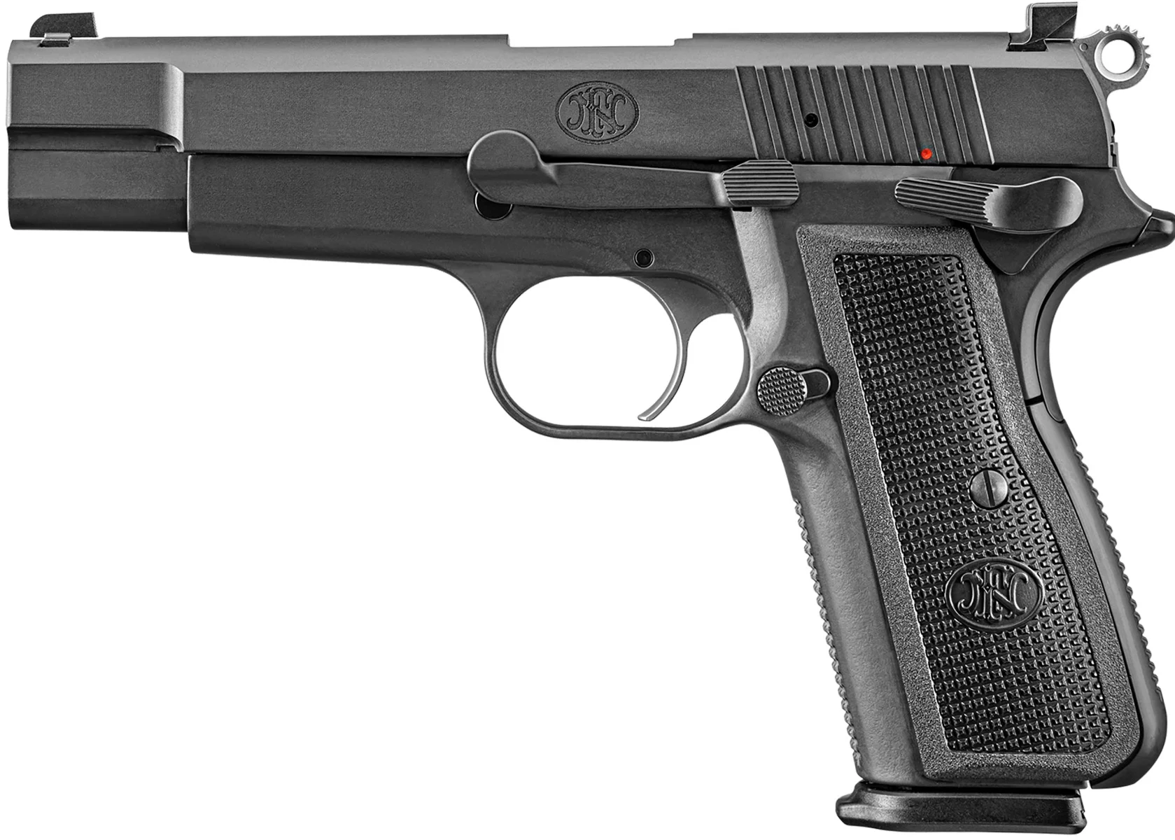 At 40-oz., the robust design keeps the signature rake of the dust cover and long arm slide release, adding ambi-controls for instinctive operation. An extended beavertail and raised hammer fit perfectly in hand. The FN High Power takes down instantly for maintenance, deletes the magazine disconnect, and ensures that most modern factory loads feed smoothly over the polished ramp of the cold hammer forged barrel.