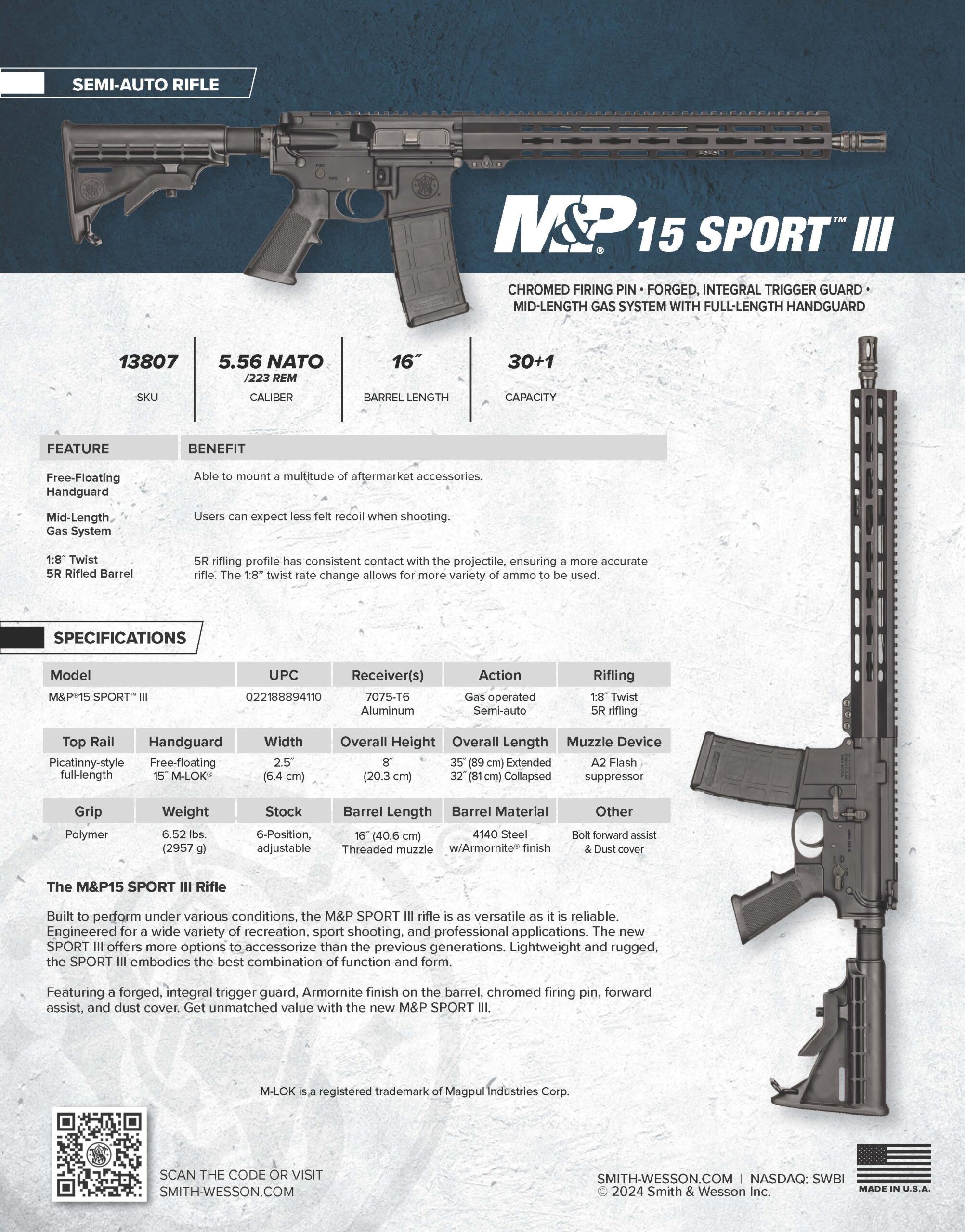 Built to perform under various conditions, the M&P SPORT III rifle is as versatile as it is reliable. Engineered for a wide variety of recreation, sport shooting, and professional applications, the new SPORT III offers more options to accessorize than the previous generations. Lightweight and rugged, the SPORT III embodies the best combination of function and form.